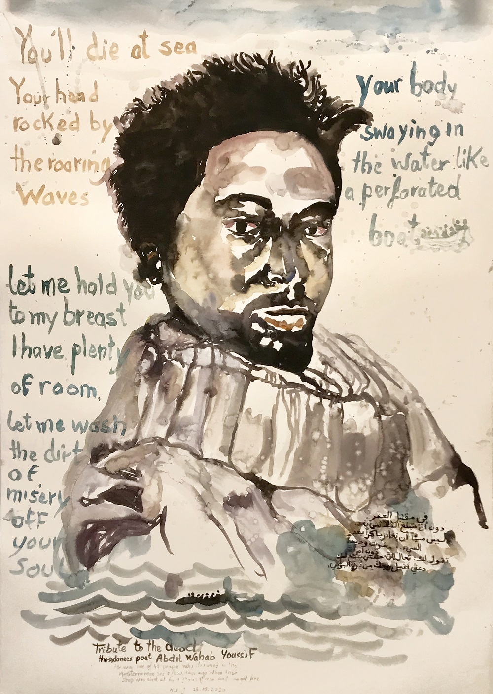 Maar de titel Beeldenstorm gaat niet alleen over het artistieke pad dat Jarram heeft afgelegd. Beeldenstorm roept onherroepelijk associaties op met de vernietiging van beelden, zoals dat gebeurde in de 16de eeuw tijdens de Reformatie, en zoals dat ook nu gebeurt met vermeende vaderlandse helden die van hun sokkels worden getrokken. Via beelden krijgt de geschiedenis niet alleen een gezicht, maar wordt de geschiedenis ook gemaakt. En soms dient die geschiedenis te worden herzien of aangevuld. ‘Eigenlijk ben ik in mijn werk constant bezig om de geschiedenis te corrigeren’, zegt Jarram. Dat doet hij niet door beelden neer te halen, maar door nieuwe monumenten te bouwen. Zoals met de pastel Le soldat inconnu (2008), waarmee hij een gezicht gaf aan de Marokkaanse mannen die tijdens de Tweede Wereldoorlog hebben meegestreden voor de vrijheid. Of met zijn recente aquarel A tribute to the dead (2020): een ode aan de Soedanese dichter Abdel Wahab Youssif, die omkwam tijdens zijn overtocht van Afrika naar Europa, op weg naar een nieuw leven en op weg naar prachtige nieuwe dingen die hij had kunnen creëren.